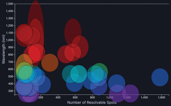 Figure 2 - Application Wavelength vs Resolvable Spots for a selection of G&H AODs. This graph illustrates the combination of large aperture, broad RF bandwidth, and high spot count (>1,000) achievable with G&H acousto-optic deflectors.