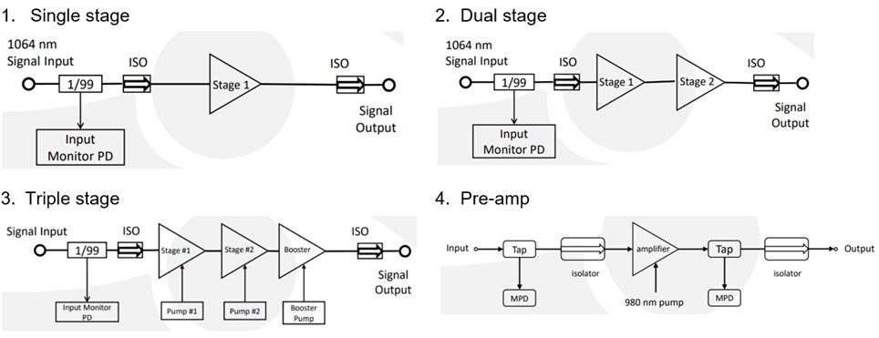 | Model | Pre-amp /Amplifier | Stage | Input/output isolation (dB) | Input power level (dBm) | Output power (dBm) | Wavelength (nm) | Optical gain (dB) |