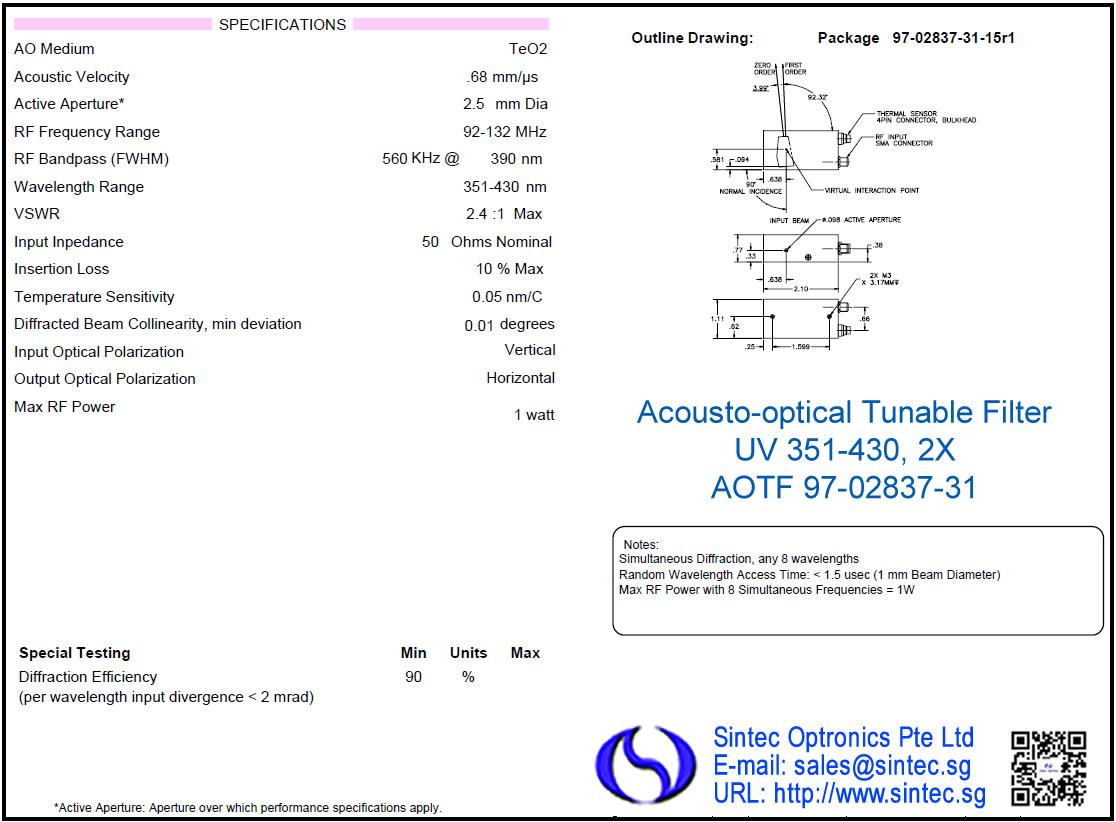 | AOTF 2837-31 | 351-430 nm | 2.5 mm | 1.0 nm |